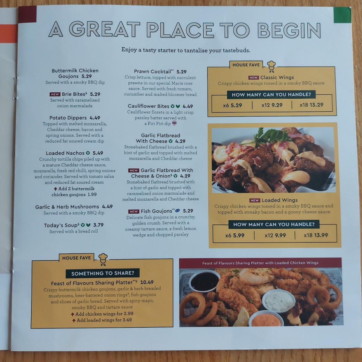 4oz* rump steak, two pork sausages, half a chicken breast and half a gammon steak. Served with beer-battered onion rings§, half a grilled tomato, two fried eggs, garden peas and skin-on chips (1,221kcal)