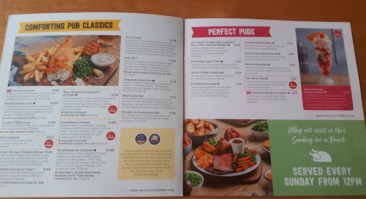 Served with warm custard (753kcal) or vanilla ice cream (720kcal)