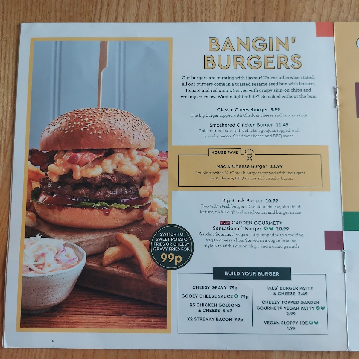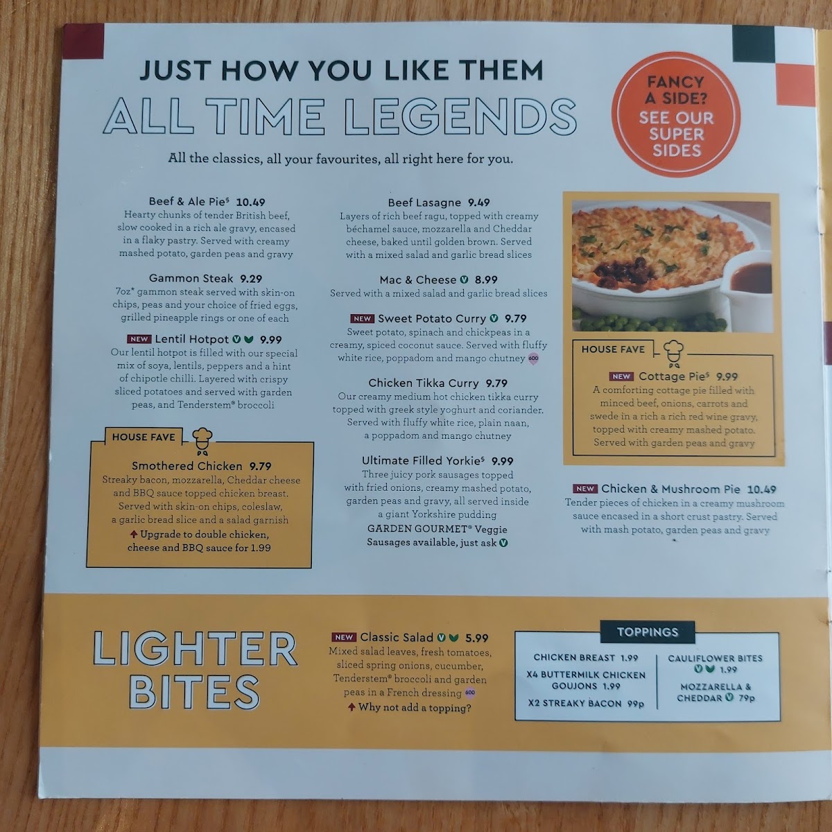 Crispy chicken goujons topped with Cheddar cheese and streaky bacon. A gammon steak topped with pineapple and Cheddar cheese and a 4oz* rump steak topped with a fried egg. All served with skin-on chips, beer-battered onion rings§, coleslaw and a s...