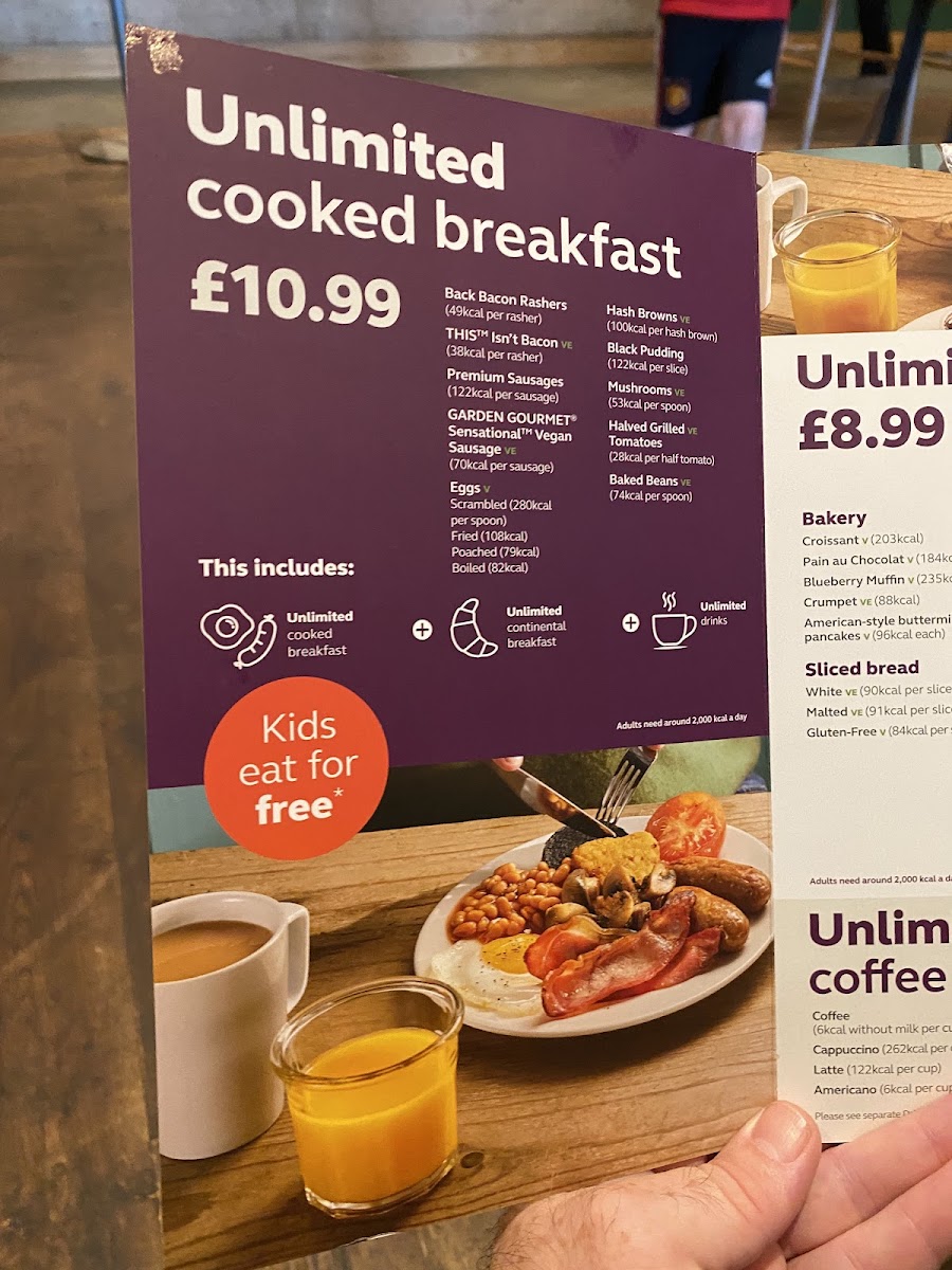 With skin-on chips, garden peas, grilled tomato (568kcal)and your choice of fried eggs (216kcal), grilled pineapple rings (49kcal) or one of each (133kcal)